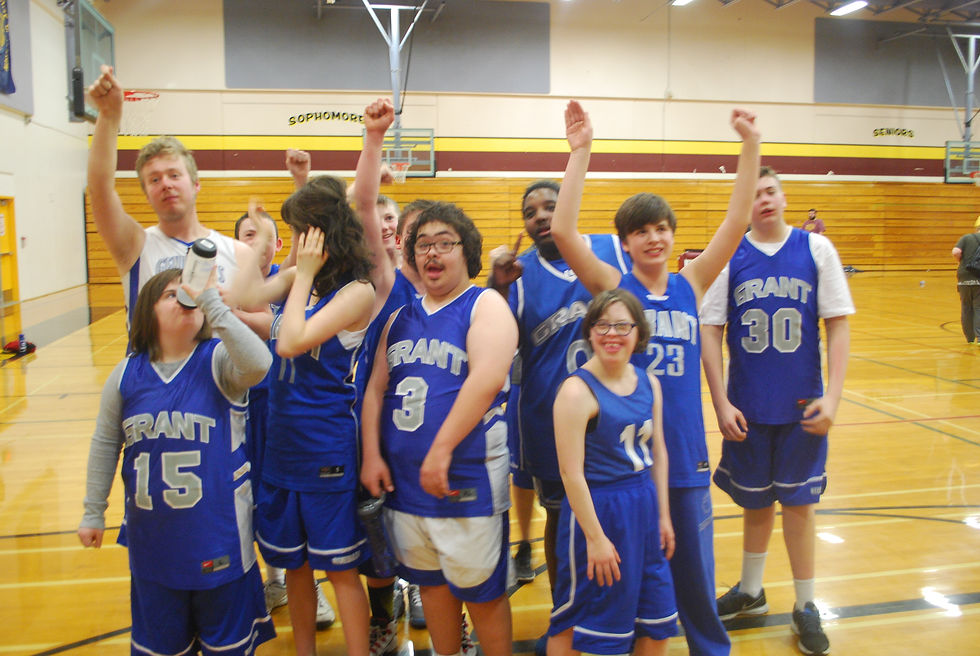 On Wednesday, February 15th, Grant High School’s Special Olympics Unified Basketball team played Cleveland High School. The stands were full of Grant and Cleveland students, parents, community members, teachers, Grant’s band, and members of Grant Youth Basketball. At the beginning of the game, all members of both teams were announced, and every player received big cheers. There were posters in the gym for the seniors on the team. The energy in the gym was overwhelmingly positive, and cheers erupted every time either team scored a basket. During the game, a “Minute to Win it” fundraiser raised $450 for Special Olympics.